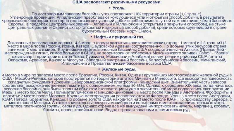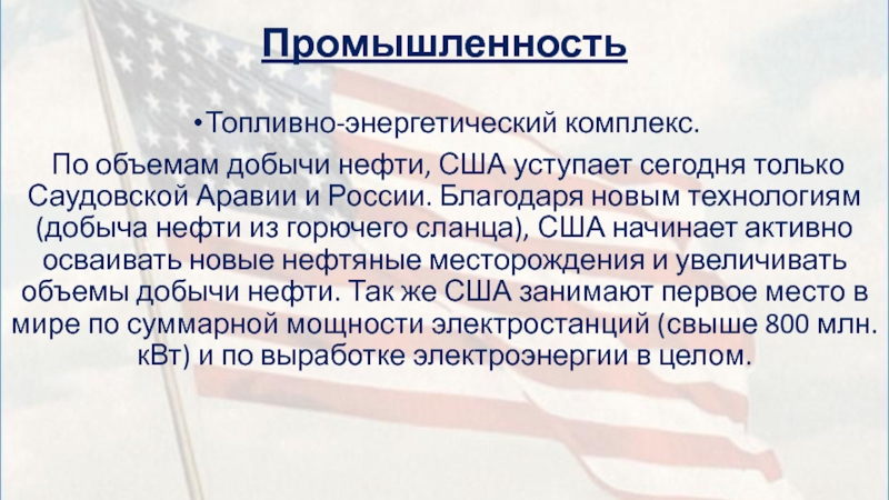 Аравии и России. Благодаря новым технологиям (добыча нефти из горючего сланца), США начинает активно осваивать новые нефтяные месторождения и увеличивать объемы добычи нефти. Так же США занимают первое место в мире по суммарной мощности электростанций (свыше 800 млн. кВт) и по выработке электроэнергии в целом.