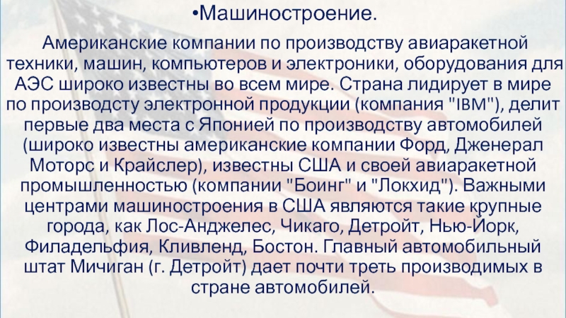оборудования для АЭС широко известны во всем мире. Страна лидирует в мире по производсту электронной продукции (компания "IBM"), делит первые два места с Японией по производству автомобилей (широко известны американские компании Форд, Дженерал Моторс и Крайслер), известны США и своей авиаракетной промышленностью (компании "Боинг" и "Локхид"). Важными центрами машиностроения в США являются такие крупные города, как Лос-Анджелес, Чикаго, Детройт, Нью-Йорк, Филадельфия, Кливленд, Бостон. Главный автомобильный штат Мичиган (г. Детройт) дает почти треть производимых в стране автомобилей.