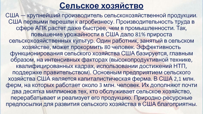 агробизнесу. Производительность труда в сфере АПК растет даже быстрее, чем в промышленности. Так, повышение урожайности в США дало 81% прироста сельскохозяйственных культур. Один работник, занятый в сельском хозяйстве, может прокормить 80 человек. Эффективность функционирования сельского хозяйства США базируется, главным образом, на интенсивных факторах (высокопродуктивной технике, квалифицированных кадрах, использовании достижений НТП, поддержке правительством). Основным предприятием сельского хозяйства США является капиталистическая ферма. В США 2,1 млн. ферм, на которых работает около 3 млн. человек. Их дополняют почти два десятка миллионов тех, кто обслуживает сельское хозяйство, перерабатывает и реализует его продукцию. Природно-ресурсные предпосылки для развития сельского хозяйства в США благоприятны.