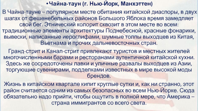 в двух шагах от фешенебельных районов Большого Яблока время замедляет свой бег. Этнический колорит сквозит в этом месте во всем: традиционные элементы архитектуры Поднебесной, красные фонарики, вывески, написанные иероглифами, шумные толпы выходцев из Китая, Вьетнама и прочих дальневосточных стран.