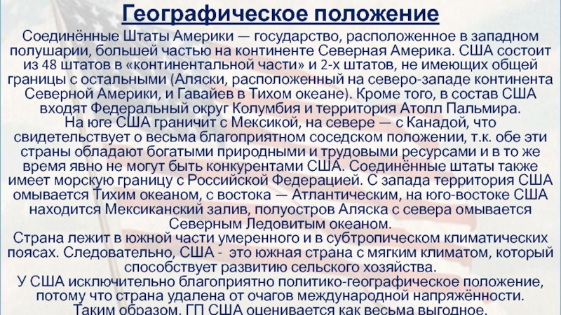 У США исключительно благоприятно политико-географическое положение, потому что страна удалена от очагов международной напряжённости.