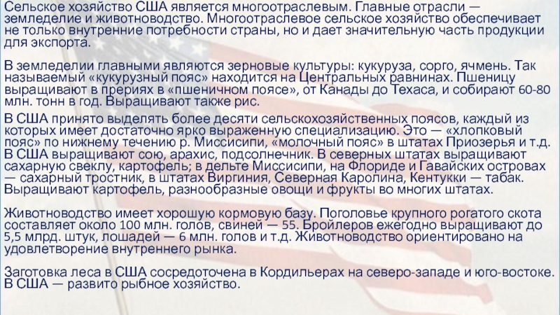 Слайд 31Сельское хозяйство США является многоотраслевым. Главные отрасли — земледелие и животноводство.