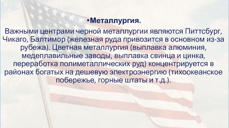 привозится в основном из-за рубежа). Цветная металлургия (выплавка алюминия, медеплавильные заводы, выплавка свинца и цинка, переработка полиметаллических руд) концентрируется в районах богатых на дешевую электроэнергию (тихоокеанское побережье, горные штаты и т.д.).