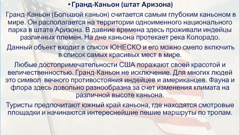 Любые достопримечательности США поражают своей красотой и величественностью. Гранд-Каньон не исключение. Для многих людей это символ вечного противостояния индейцев и американцев. Фауна и флора здесь довольно разнообразна за счет изменения климата на различной высоте каньона.