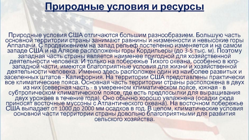 основной территории страны занимают равнины и низменности и невысокие горы Аппалачи. С продвижением на запад рельеф постепенно изменяется и на самом западе США и на Аляске расположены горы Кордильеры (до 3-5 тыс. м). Поэтому западная часть страны является наименее пригодной для хозяйственной деятельности человека. И только на побережье Тихого океана, особенно в юго-западной части, имеются благоприятные условия для жизни и хозяйственной деятельности человека. Именно здесь расположен один из наиболее развитых и заселенных штатов - Калифорния. На территории США представлены практически все климатические пояса. Основная часть территории страны расположена в двух из них (северная часть - в умеренном климатическом поясе, южная - в субтропическом климатическом поясе, где есть предпосылки для выращивания двух урожаев в течение года). Оно обычно хорошо увлажнена (осадки сюда приносят восточные муссоны с Атлантического океана). На восточном побережье США выпадает от 1000 до 2000 мм осадков в год. В целом, климатические условия основной части территории страны довольно благоприятными для развития сельского хозяйства.