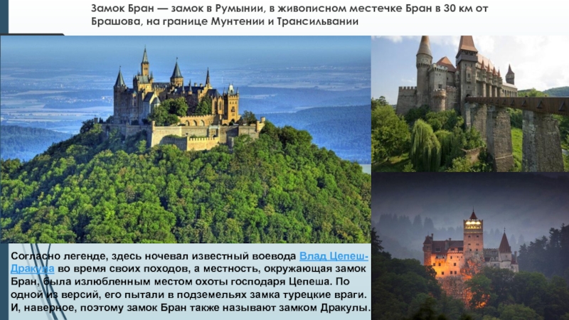 Согласно легенде, здесь ночевал известный воевода Влад Цепеш-Дракула во время своих походов, а местность, окружающая замок Бран, была излюбленным местом охоты господаря Цепеша. По одной из версий, его пытали в подземельях замка турецкие враги. И, наверное, поэтому замок Бран также называют замком Дракулы.
