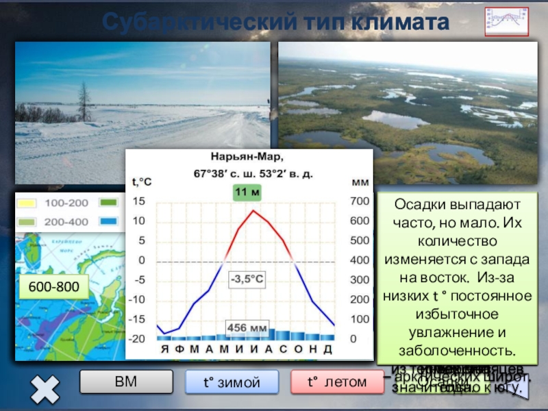 7. Осадков выпадает 600 мм на севере и 200 мм на юге. Формируется климат под кУВ, перемещающихся чаще всего в широтном направлении. В меридиональном направлении на юг продвигается холодный арктический воздух. Лето теплое, на юге даже знойное (+15 до +26 °), а зимой температуры -15-25 °.