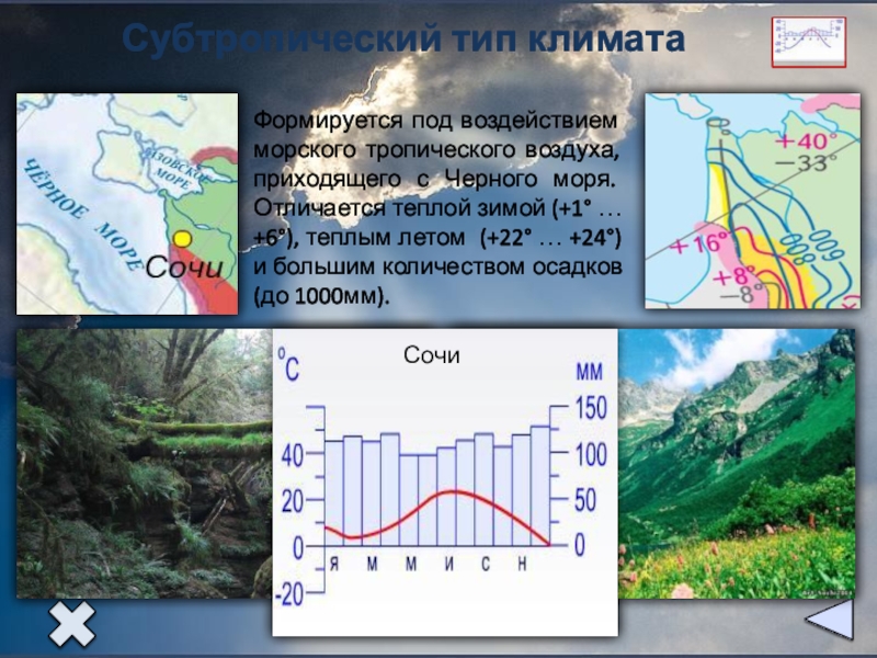 6. Формируется под воздействием морского тропического воздуха, приходящего с Черного моря. Отличается теплой зимой (+1° +6°), теплым летом (+22° +24°) и большим количеством осадков (до 1000мм).