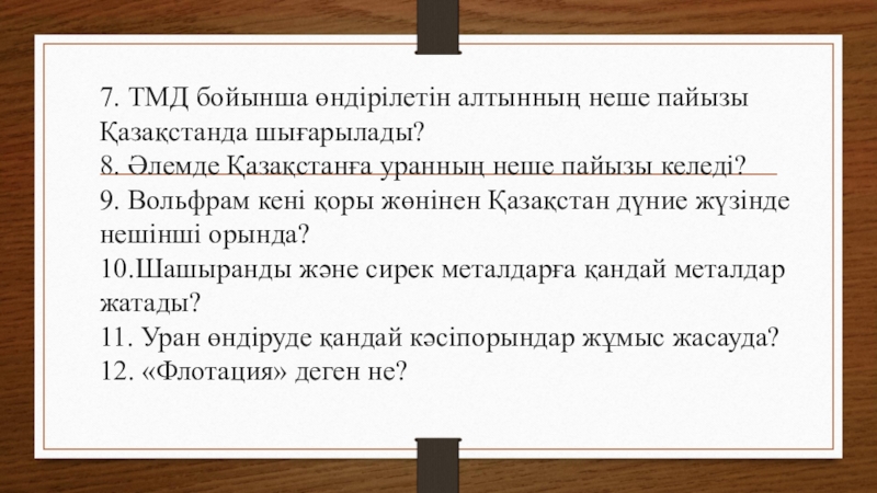 7. ТМД бойынша өндірілетін алтынның неше пайызы Қазақстанда шығарылады? 8. Әлемде Қазақстанға уранның неше пайызы келеді? 9.