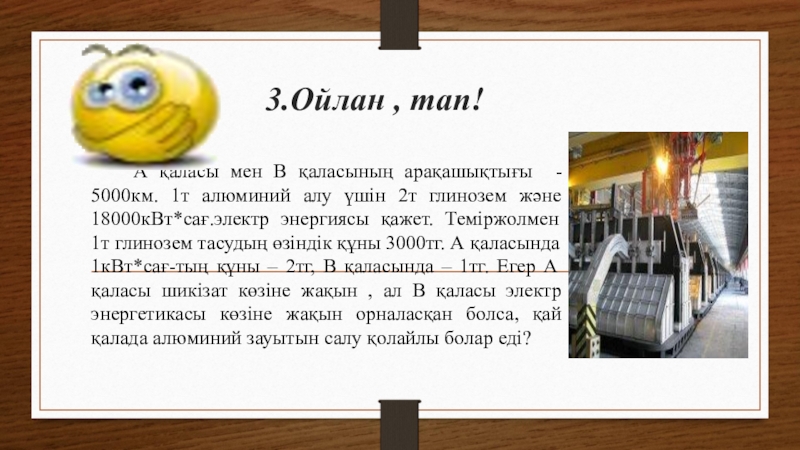 3.Ойлан , тап!   А қаласы мен В қаласының арақашықтығы - 5000км. 1т алюминий алу үшін