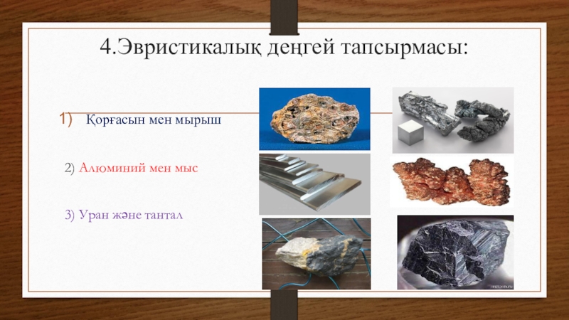 4.Эвристикалық деңгей тапсырмасы:  Қорғасын мен мырыш2) Алюминий мен мыс3) Уран және тантал