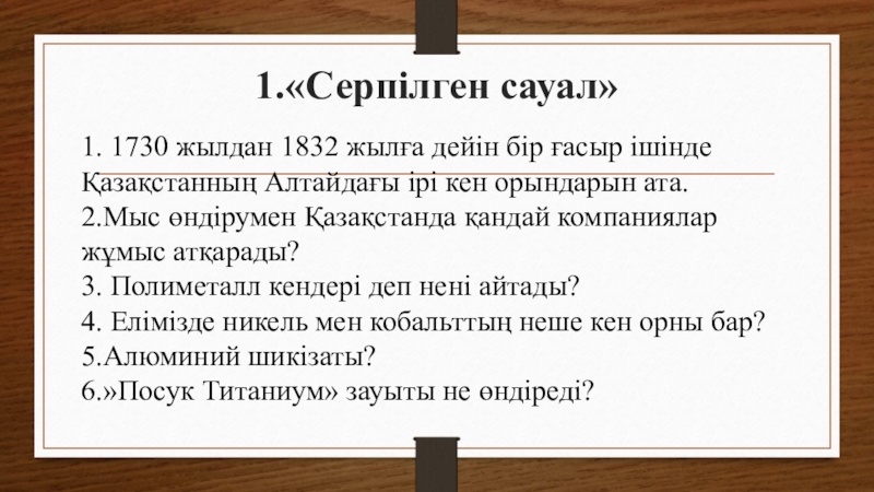 1.«Серпілген сауал»1. 1730 жылдан 1832 жылға дейін бір ғасыр ішінде Қазақстанның Алтайдағы ірі кен орындарын ата.2.Мыс өндірумен