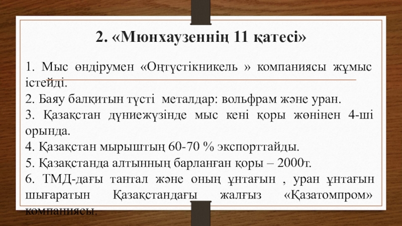 2. «Мюнхаузеннің 11 қатесі»1. Мыс өндірумен «Оңтүстікникель » компаниясы жұмыс істейді.2. Баяу балқитын түсті металдар: вольфрам және