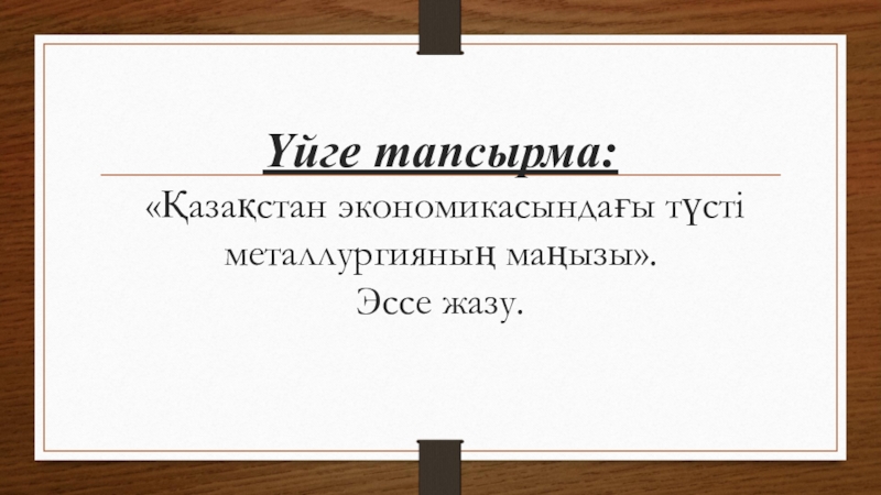 Слайд 21Үйге тапсырма: «Қазақстан экономикасындағы түсті металлургияның маңызы». Эссе жазу.