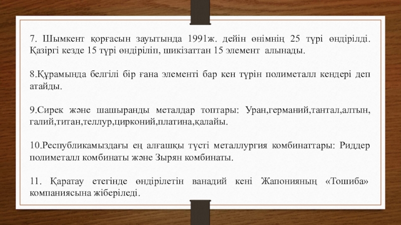 Слайд 77. Шымкент қорғасын зауытында 1991ж. дейін өнімнің 25 түрі өндірілді. Қазіргі