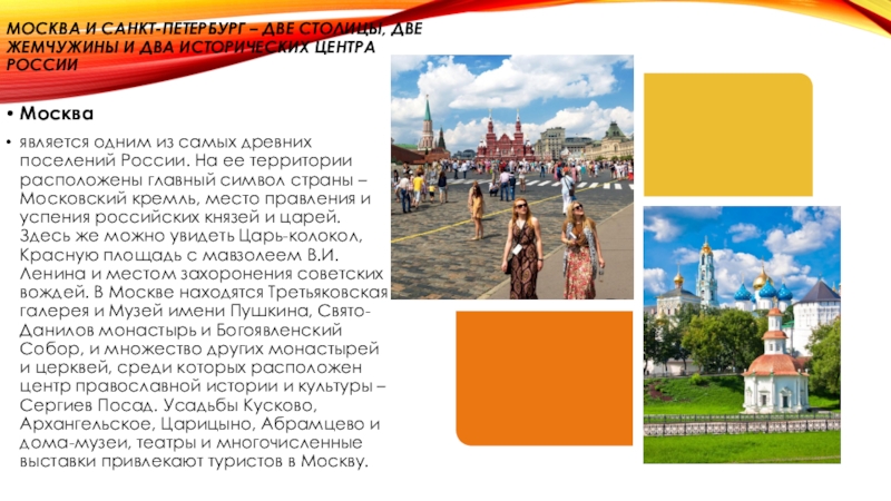 является одним из самых древних поселений России. На ее территории расположены главный символ страны – Московский кремль, место правления и успения российских князей и царей. Здесь же можно увидеть Царь-колокол, Красную площадь с мавзолеем В.И.Ленина и местом захоронения советских вождей. В Москве находятся Третьяковская галерея и Музей имени Пушкина, Свято-Данилов монастырь и Богоявленский Собор, и множество других монастырей и церквей, среди которых расположен центр православной истории и культуры – Сергиев Посад. Усадьбы Кусково, Архангельское, Царицыно, Абрамцево и дома-музеи, театры и многочисленные выставки привлекают туристов в Москву.