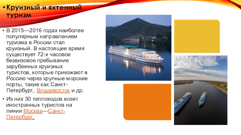 России стал круизный. В настоящее время существует 72-х часовое безвизовое пребывание зарубежных круизных туристов, которые приезжают в Россию через крупные морские порты, такие как Санкт-Петербург,. Владивосток и др.
