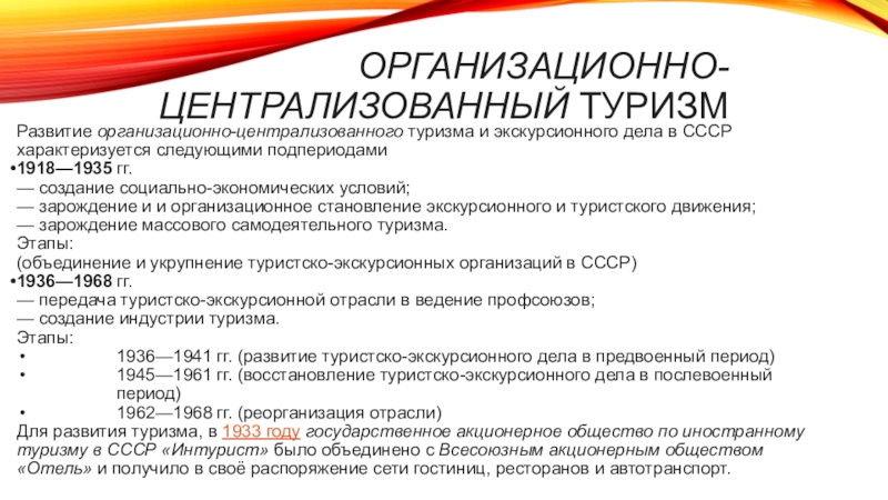 Развитие организационно-централизованного туризма и экскурсионного дела в СССР характеризуется следующими подпериодами