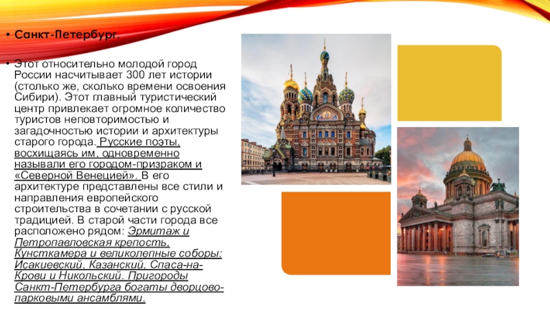 сколько времени освоения Сибири). Этот главный туристический центр привлекает огромное количество туристов неповторимостью и загадочностью истории и архитектуры старого города. Русские поэты, восхищаясь им, одновременно называли его городом-призраком и «Северной Венецией». В его архитектуре представлены все стили и направления европейского строительства в сочетании с русской традицией. В старой части города все расположено рядом: Эрмитаж и Петропавловская крепость, Кунсткамера и великолепные соборы: Исакиевский, Казанский, Спаса-на-Крови и Никольский. Пригороды Санкт-Петербурга богаты дворцово-парковыми ансамблями.