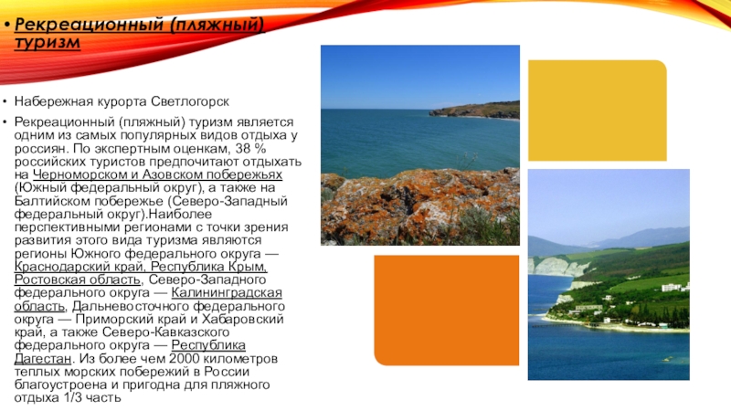 популярных видов отдыха у россиян. По экспертным оценкам, 38 % российских туристов предпочитают отдыхать на Черноморском и Азовском побережьях (Южный федеральный округ), а также на Балтийском побережье (Северо-Западный федеральный округ).Наиболее перспективными регионами с точки зрения развития этого вида туризма являются регионы Южного федерального округа — Краснодарский край, Республика Крым, Ростовская область, Северо-Западного федерального округа — Калининградская область, Дальневосточного федерального округа — Приморский край и Хабаровский край, а также Северо-Кавказского федерального округа — Республика Дагестан. Из более чем 2000 километров теплых морских побережий в России благоустроена и пригодна для пляжного отдыха 1/3 часть
