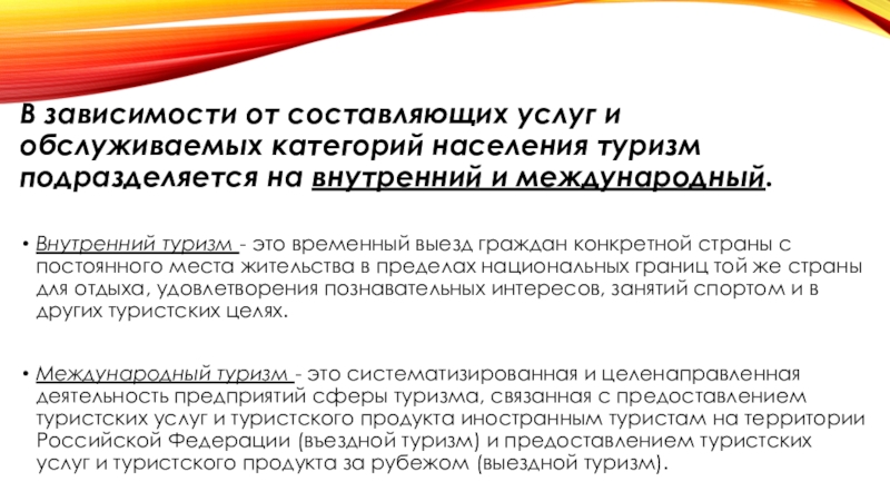 Слайд 5В зависимости от составляющих услуг и обслуживаемых категорий населения туризм подразделяется