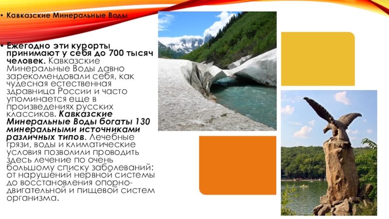 человек. Кавказские Минеральные Воды давно зарекомендовали себя, как чудесная естественная здравница России и часто упоминается еще в произведениях русских классиков. Кавказские Минеральные Воды богаты 130 минеральными источниками различных типов. Лечебные грязи, воды и климатические условия позволили проводить здесь лечение по очень большому списку заболеваний: от нарушений нервной системы до восстановления опорно-двигательной и пищевой систем организма.