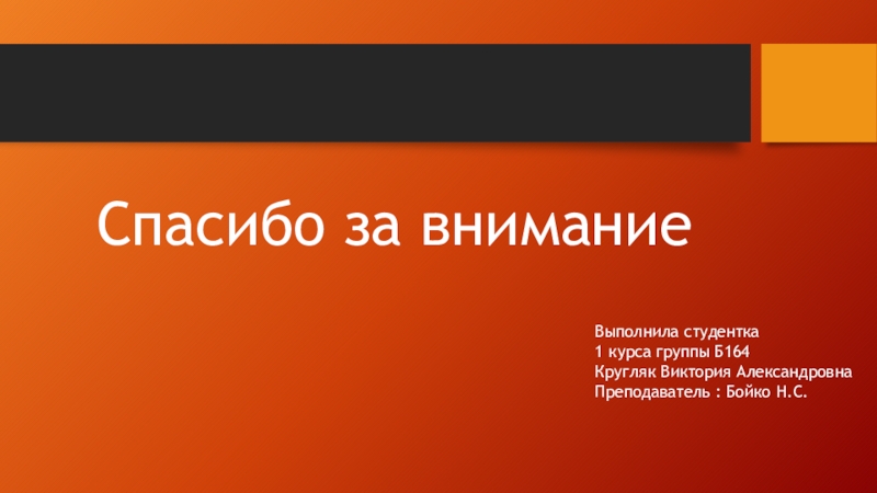 Спасибо за внимание Выполнила студентка 1 курса группы Б164 Кругляк Виктория АлександровнаПреподаватель : Бойко Н.С.