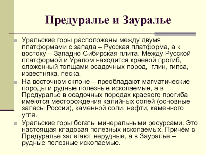 На восточном склоне – преобладают магматические породы и рудные полезные ископаемые, а в Предуралье в осадочных породах краевого прогиба имеются месторождения калийных солей (основные запасы России), каменной соли, нефти, каменного угля.
