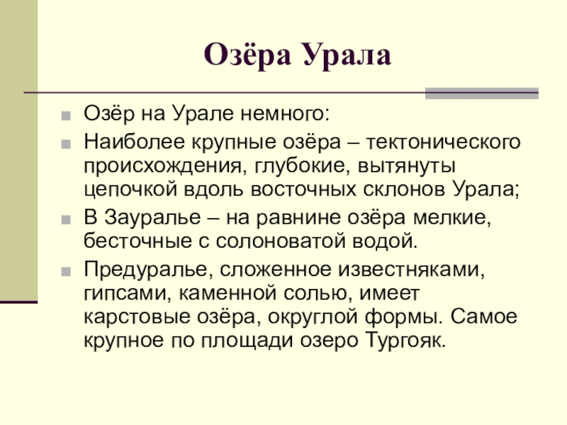 небольшими высотами. Перевал, преодолеваемый железной дорогой между Пермью и Екатеринбургом, едва превышает 400 м над уровнем моря, а если учесть, что прилегающая местность поднята до 250 м, то Урал здесь можно пересечь, не заметив, что это горы. Выветривание создало здесь много причудливых скал: Каменная Палатка, Чёртово Городище, Чёртов Стул и т. д. Среднее Зауралье богато озёрами. Самое крупное из них Иткуль. Берега озёр окаймлены борами. Тёмнохвойную тайгу на юге сменяют смешанные леса, на юго-западе — массивы липы. К сожалению, из-за интенсивной вырубки лесов осталось крайне мало.