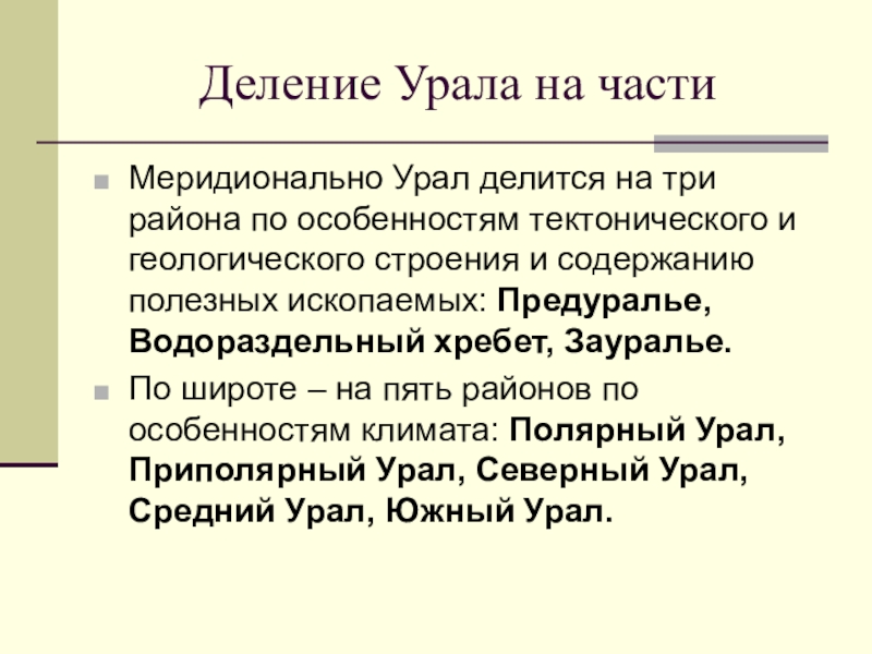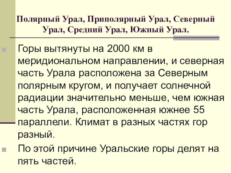 Слайд 38Полярный Урал, Приполярный Урал, Северный Урал, Средний Урал, Южный Урал.