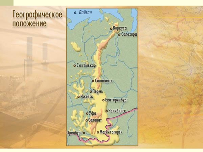 С запада к Уралу подходит Русская равнина, а с востока – Западно-Сибирская равнина. Урал – граница между Европой и Азией. Переводится Урал – пояс (с тюркского). Но у Урала много было названий – в античные времена – «Рифейские горы»; до 17 века – «Камень», «Каменный пояс».