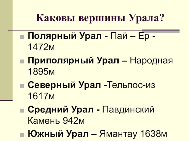 Слайд 10 Каковы вершины Урала?