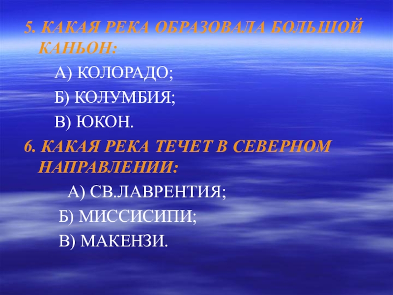 5. КАКАЯ РЕКА ОБРАЗОВАЛА БОЛЬШОЙ КАНЬОН:    А) КОЛОРАДО;    Б) КОЛУМБИЯ;