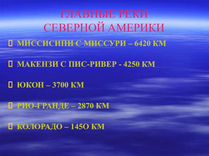 ГЛАВНЫЕ РЕКИ  СЕВЕРНОЙ АМЕРИКИМИССИСИПИ С МИССУРИ – 6420 КММАКЕНЗИ С ПИС-РИВЕР - 4250 КМЮКОН – 3700