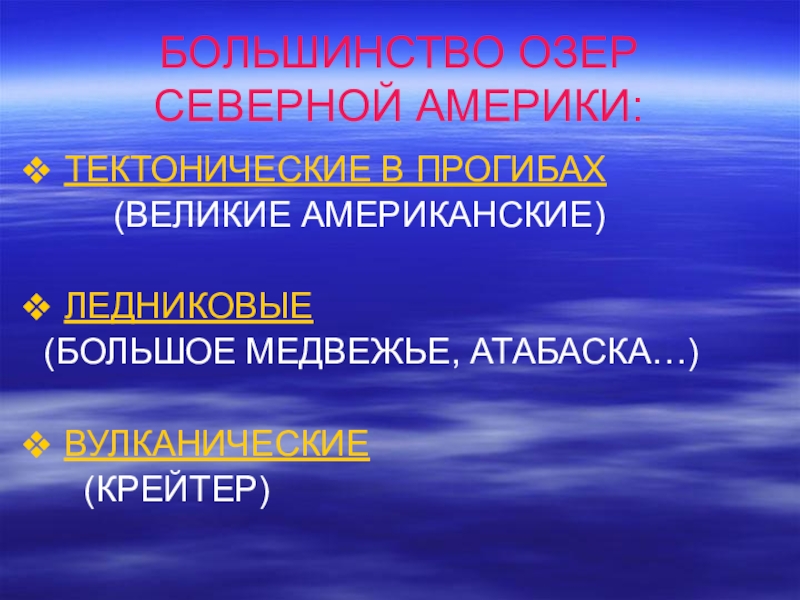 БОЛЬШИНСТВО ОЗЕР СЕВЕРНОЙ АМЕРИКИ:ТЕКТОНИЧЕСКИЕ В ПРОГИБАХ	  (ВЕЛИКИЕ АМЕРИКАНСКИЕ)ЛЕДНИКОВЫЕ (БОЛЬШОЕ МЕДВЕЖЬЕ, АТАБАСКА…)ВУЛКАНИЧЕСКИЕ	 (КРЕЙТЕР)