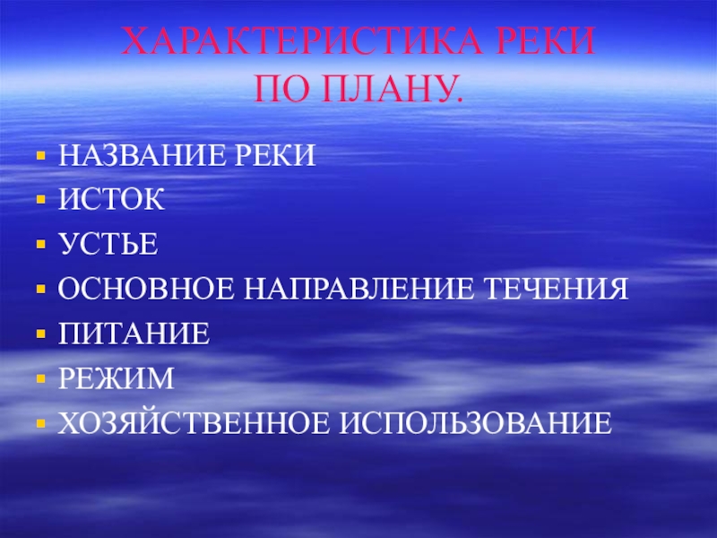 ХАРАКТЕРИСТИКА РЕКИ ПО ПЛАНУ.НАЗВАНИЕ РЕКИИСТОКУСТЬЕОСНОВНОЕ НАПРАВЛЕНИЕ ТЕЧЕНИЯПИТАНИЕРЕЖИМХОЗЯЙСТВЕННОЕ ИСПОЛЬЗОВАНИЕ