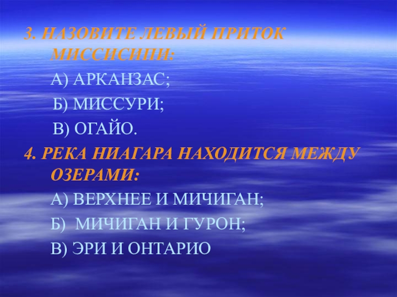 3. НАЗОВИТЕ ЛЕВЫЙ ПРИТОК МИССИСИПИ:   А) АРКАНЗАС;	 Б) МИССУРИ;	 В) ОГАЙО.4. РЕКА НИАГАРА НАХОДИТСЯ МЕЖДУ