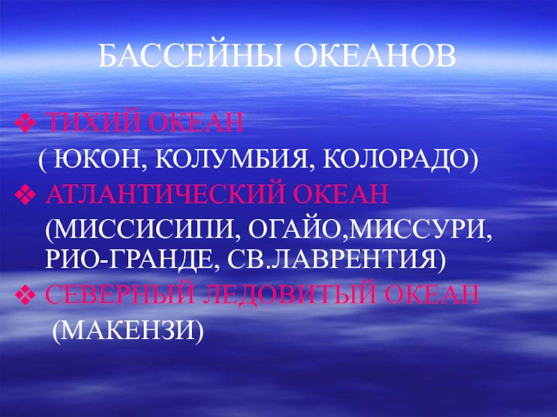 БАССЕЙНЫ ОКЕАНОВТИХИЙ ОКЕАН  ( ЮКОН, КОЛУМБИЯ, КОЛОРАДО)АТЛАНТИЧЕСКИЙ ОКЕАН  (МИССИСИПИ, ОГАЙО,МИССУРИ, РИО-ГРАНДЕ, СВ.ЛАВРЕНТИЯ)СЕВЕРНЫЙ ЛЕДОВИТЫЙ ОКЕАН	(МАКЕНЗИ)