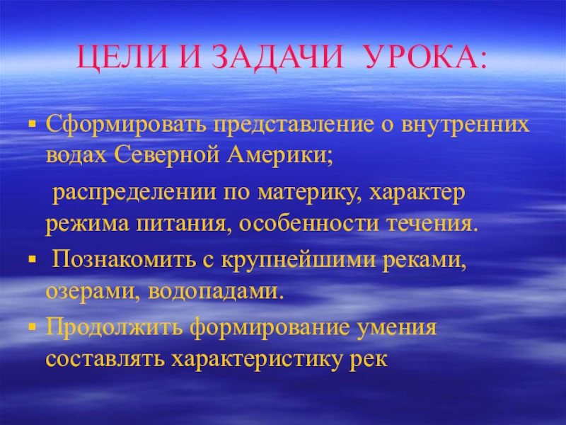 ЦЕЛИ И ЗАДАЧИ УРОКА:Сформировать представление о внутренних водах Северной Америки; 	распределении по материку, характер режима питания, особенности