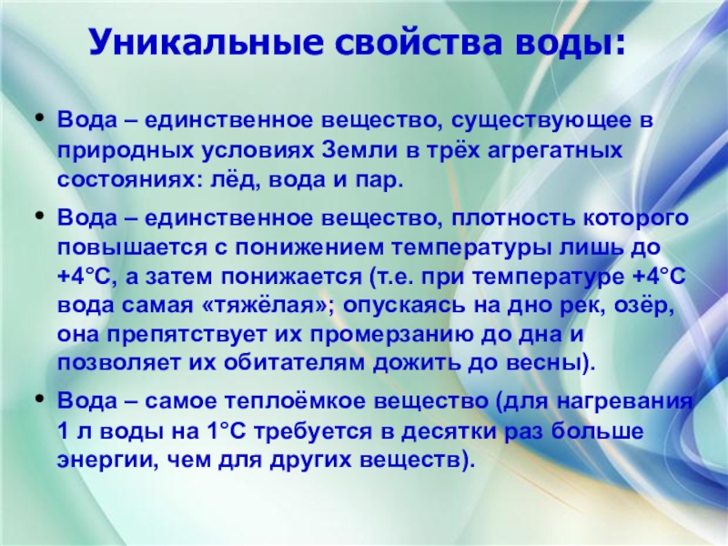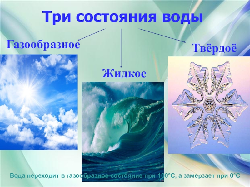 Вода переходит в газообразное состояние при 100°С, а замерзает при 0°С