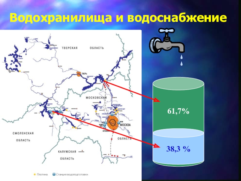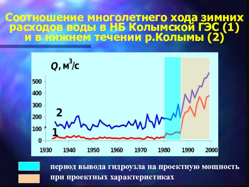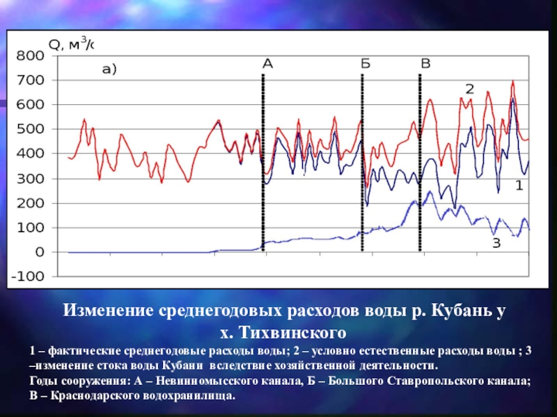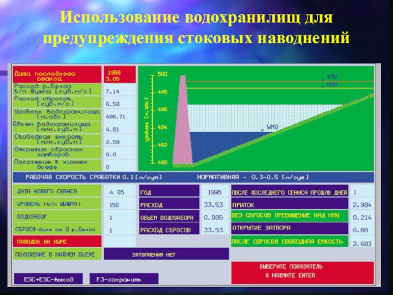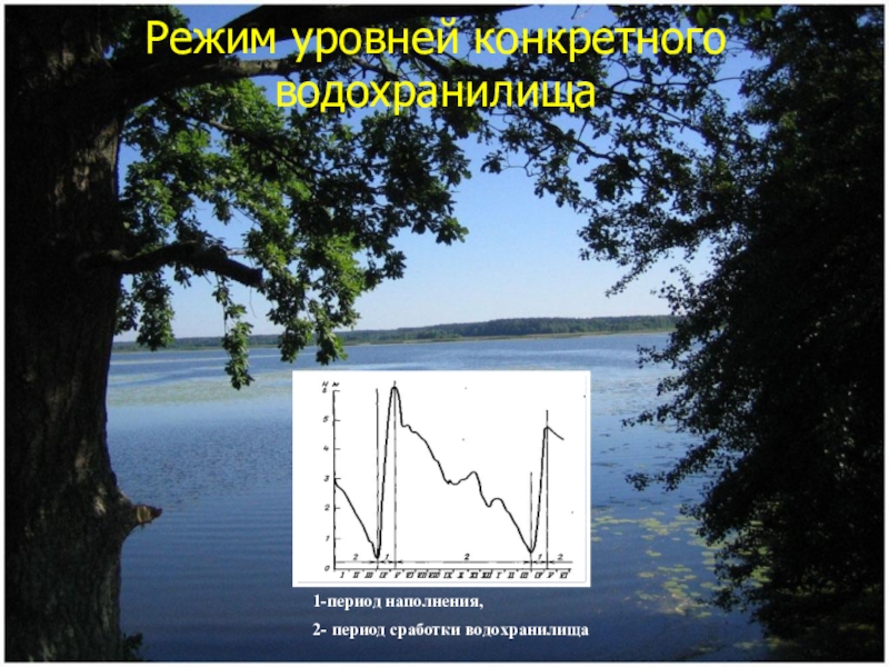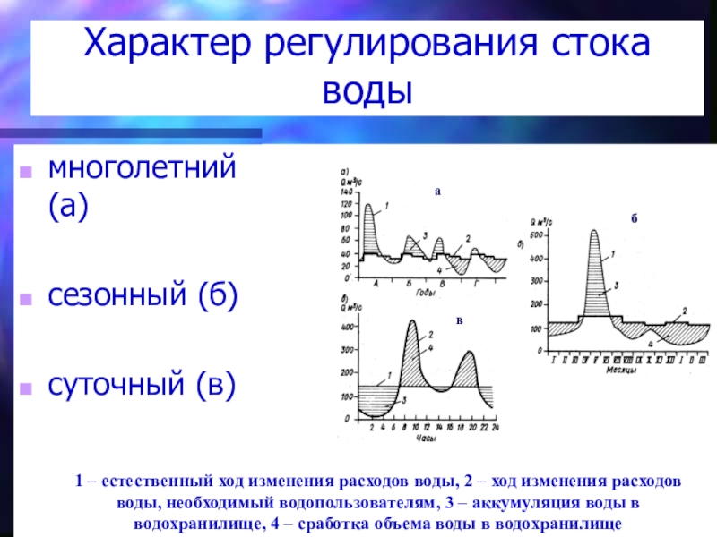 1 – естественный ход изменения расходов воды, 2 – ход изменения расходов воды, необходимый водопользователям, 3 – аккумуляция воды в водохранилище, 4 – сработка объема воды в водохранилище