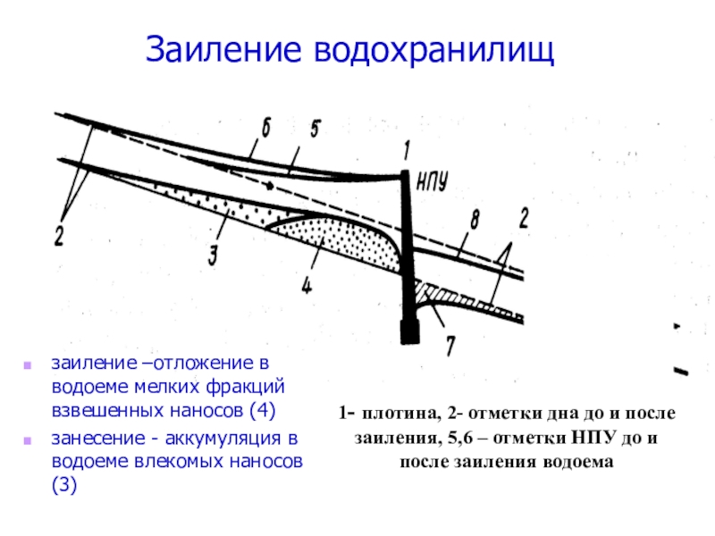 заиление –отложение в водоеме мелких фракций взвешенных наносов (4)