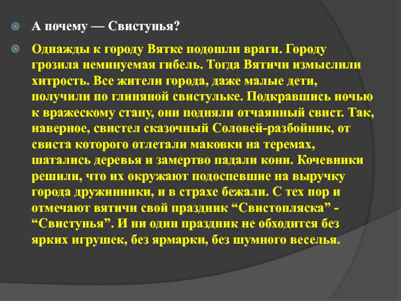 грозила неминуемая гибель. Тогда Вятичи измыслили хитрость. Все жители города, даже малые дети, получили по глиняной свистульке. Подкравшись ночью к вражескому стану, они подняли отчаянный свист. Так, наверное, свистел сказочный Соловей-разбойник, от свиста которого отлетали маковки на теремах, шатались деревья и замертво падали кони. Кочевники решили, что их окружают подоспевшие на выручку города дружинники, и в страхе бежали. С тех пор и отмечают вятичи свой праздник “Свистопляска” - “Свистунья”. И ни один праздник не обходится без ярких игрушек, без ярмарки, без шумного веселья.