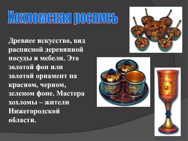 золотой фон или золотой орнамент на красном, черном, зеленом фоне. Мастера хохломы – жители Нижегородской области.