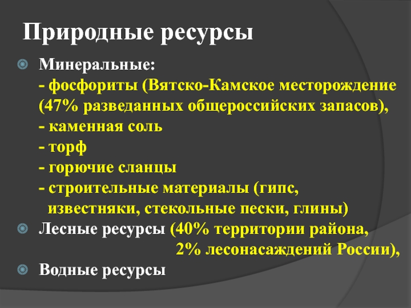 - фосфориты (Вятско-Камское месторождение (47% разведанных общероссийских