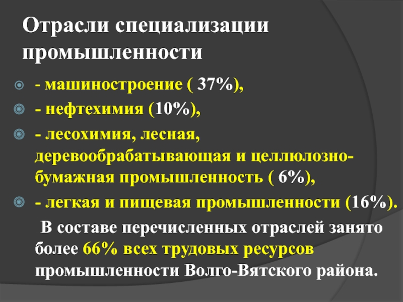В составе перечисленных отраслей занято более 66% всех трудовых ресурсов промышленности Волго-Вятского района.