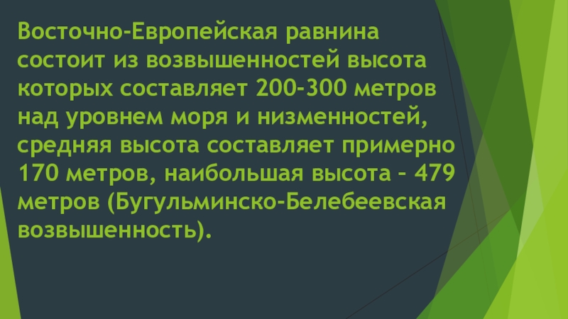 Слайд 3Восточно-Европейская равнина состоит из возвышенностей высота которых составляет 200-300 метров над