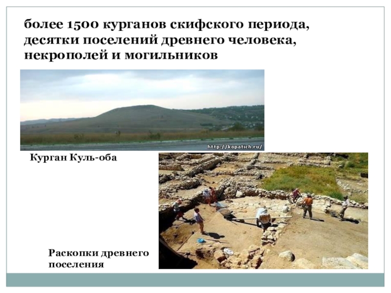 Слайд 26более 1500 курганов скифского периода, десятки поселений древнего человека, некрополей и