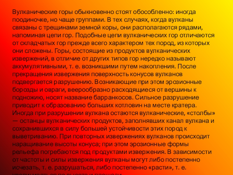 тех случаях, когда вулканы связаны с трещинами земной коры, они располагаются рядами, напоминая цепи гор. Подобные цепи вулканических гор отличаются от складчатых гор прежде всего характером тех пород, из которых они сложены. Горы, состоящие из продуктов вулканических извержений, в отличие от других типов гор нередко называют аккумулятивными, т. е. возникшими путем накопления. После прекращения извержения поверхность конусов вулканов подвергается разрушению. Возникающие при этом эрозионные борозды и овраги, веерообразно расходящиеся от вершины к подножию, носят название барранкосов. Сильное разрушение приводит к образованию больших котловин на месте кратера. Иногда при разрушении вулкана остаются вулканические, «столбы» — останцы вулканических продуктов, заполнявших канал вулкана и сохранившихся в силу большей устойчивости этих пород к выветриванию. При повторных извержениях вулканов происходит наращивание высоты конуса; при этом эрозионные формы рельефа погребаются под продуктами извержения. В зависимости от частоты и силы извержения вулканы могут либо постепенно исчезать, т. е. разрушаться, либо постепенно «расти», т. е. увеличиваться по высоте и площади.