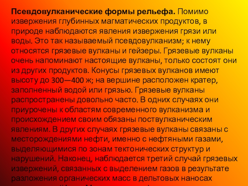 извержения грязи или воды. Это так называемый псевдовулканизм; к нему относятся грязевые вулканы и гейзеры. Грязевые вулканы очень напоминают настоящие вулканы, только состоят они из других продуктов. Конусы грязевых вулканов имеют высоту до 300—400 ж; на вершине расположен кратер, заполненный водой или грязью. Грязевые вулканы распространены довольно часто. В одних случаях они приурочены к областям современного вулканизма и происхождением своим обязаны поствулканическим явлениям. В других случаях грязевые вулканы связаны с месторождениями нефти, именно с нефтяными газами, выделяющимися по зонам тектонических структур и нарушений. Наконец, наблюдается третий случай грязевых извержений, связанных с выделением газов в результате разложения органических масс в дельтовых наносах крупных рек (Инда, Миссисипи и др.)